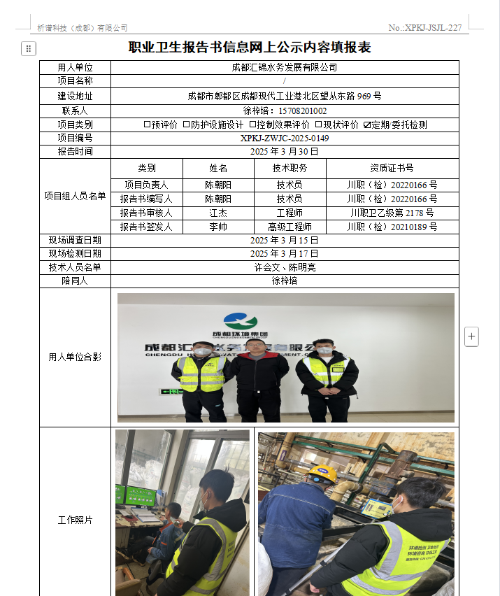 成都汇锦水务发展有限公司职业病危害因素定期检测