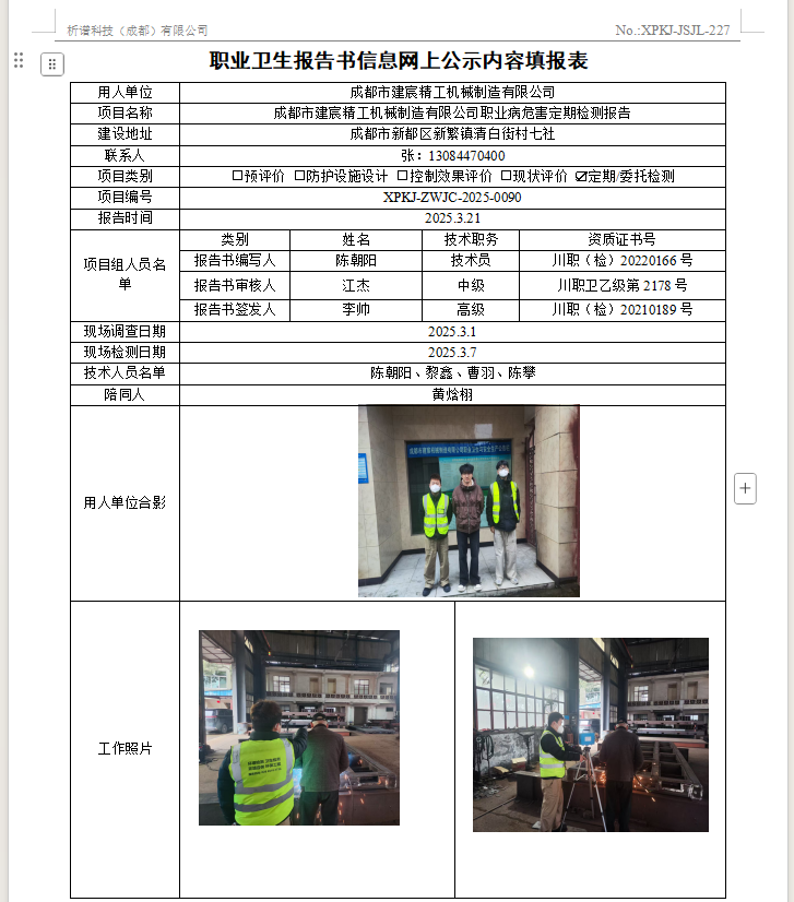 成都建宸精工机械制造有限公司职业病危害因素定期检测