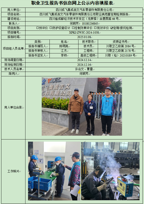 四川成飞集成吉文汽车零部件有限公司职业病危害因素定期检测