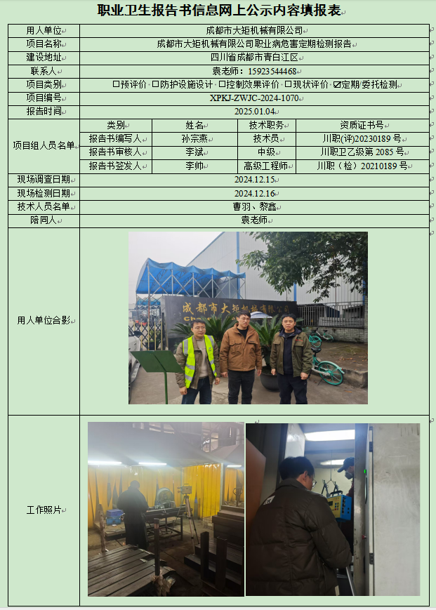 成都阿斯贝瑞科技有限公司职业病危害因素定期检测