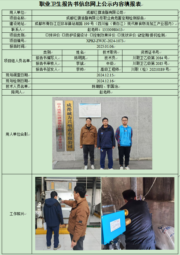 成都红旗油脂有限公司职业病危害因素定期检测