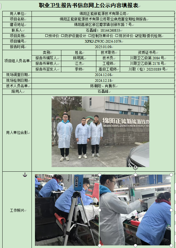 绵阳正能新能源技术有限公司职业病危害因素定期检测