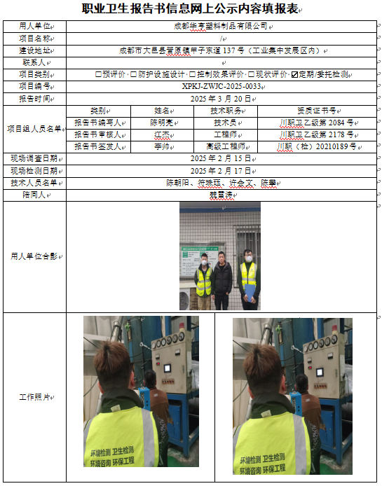 成都华亨塑料制品有限公司职业病危害因素定期检测