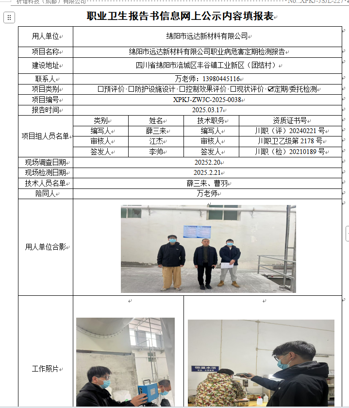 绵阳市远达新材料有限公司职业病危害因素定期检测