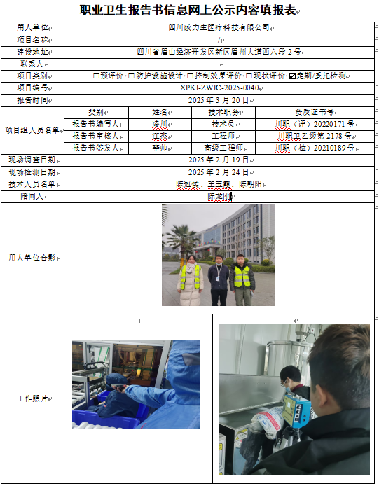 四川威力生医疗科技有限公司职业病危害因素定期检测
