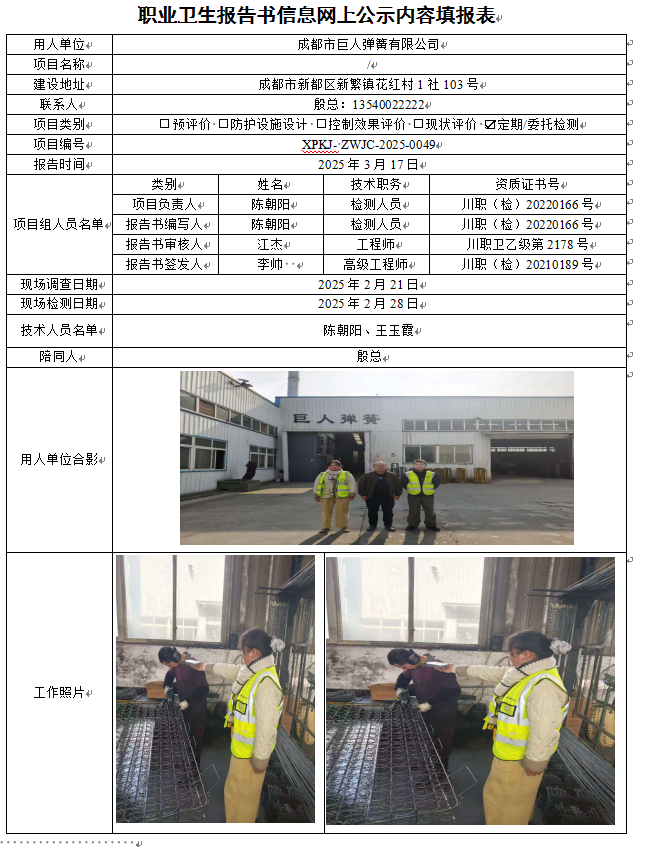 成都市巨人弹簧有限公司职业病危害因素定期检测