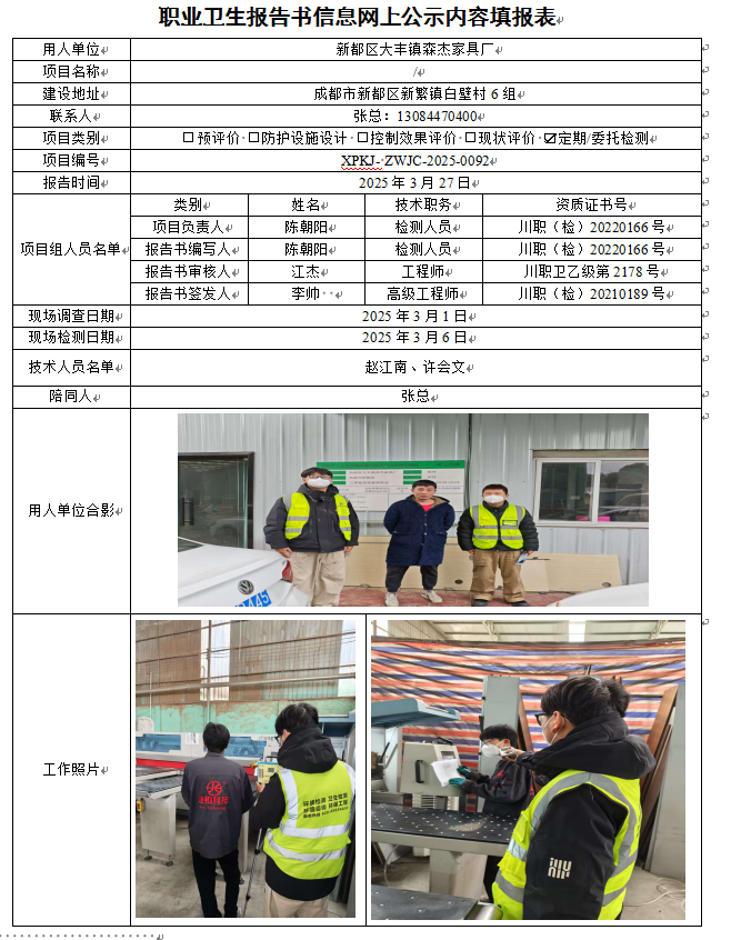 新都区大丰镇森杰家具厂职业病危害因素定期检测