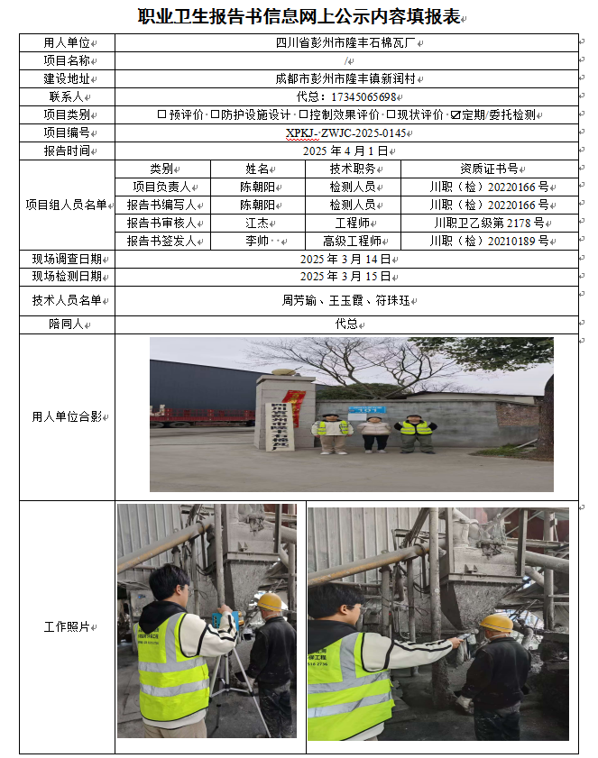 四川省彭州市隆丰石棉瓦厂职业病危害因素定期检测