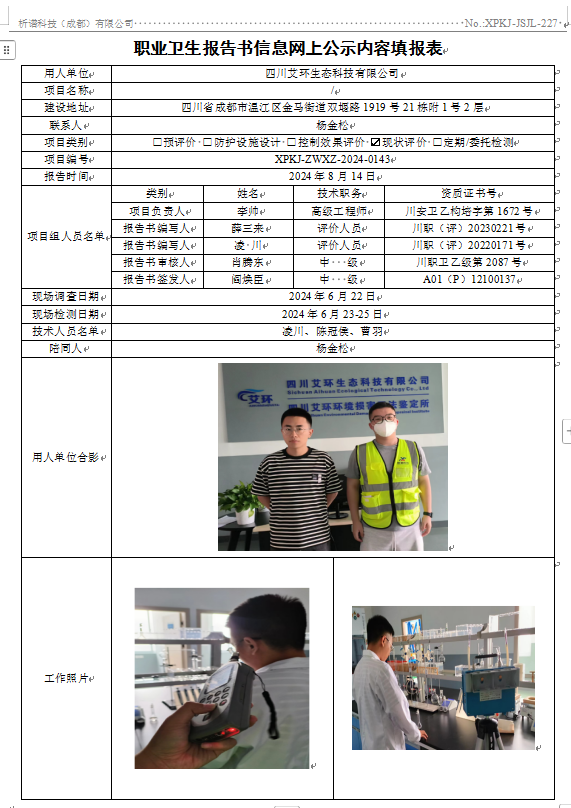 四川艾环生态科技有限公司职业病危害因素现状评价