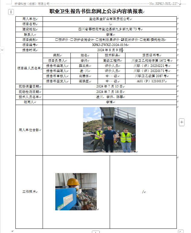 盐边县黑金矿业有限责任公司职业病危害因素现状评价