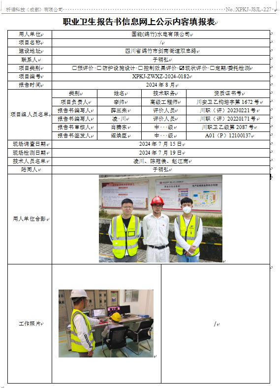 国能(绵竹)水电有限公司职业病危害因素现状评价