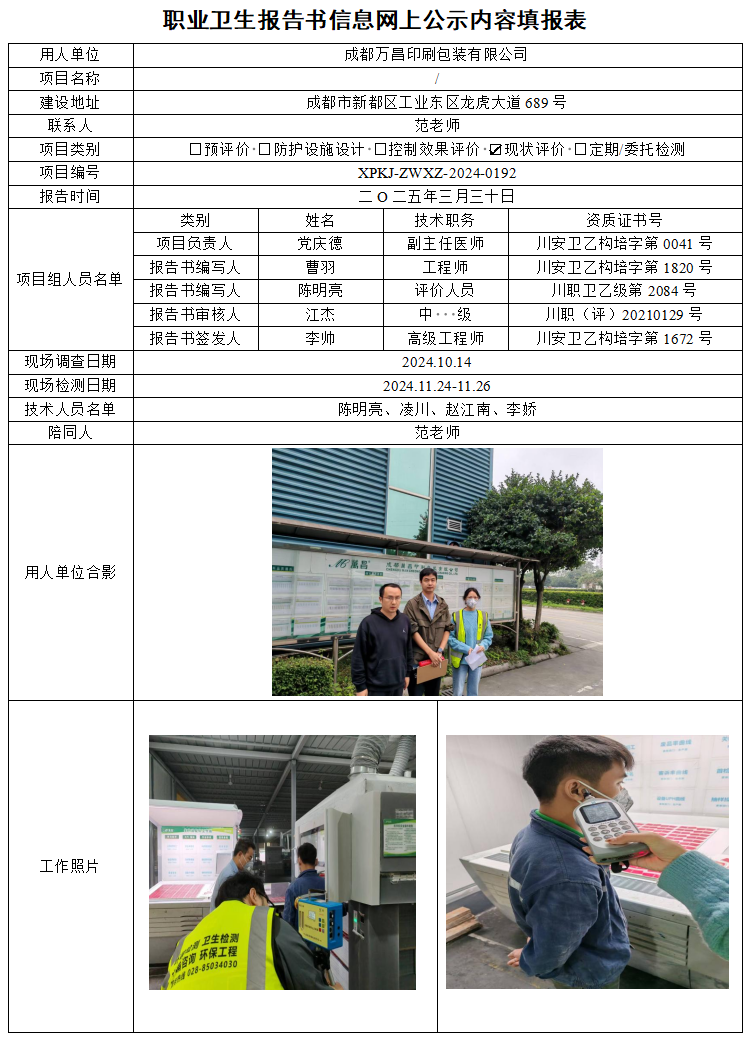 成都万昌印刷包装有限公司职业病危害因素现状评价