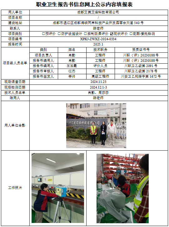 成都艾美艾佳科技有限公司职业病危害因素现状评价