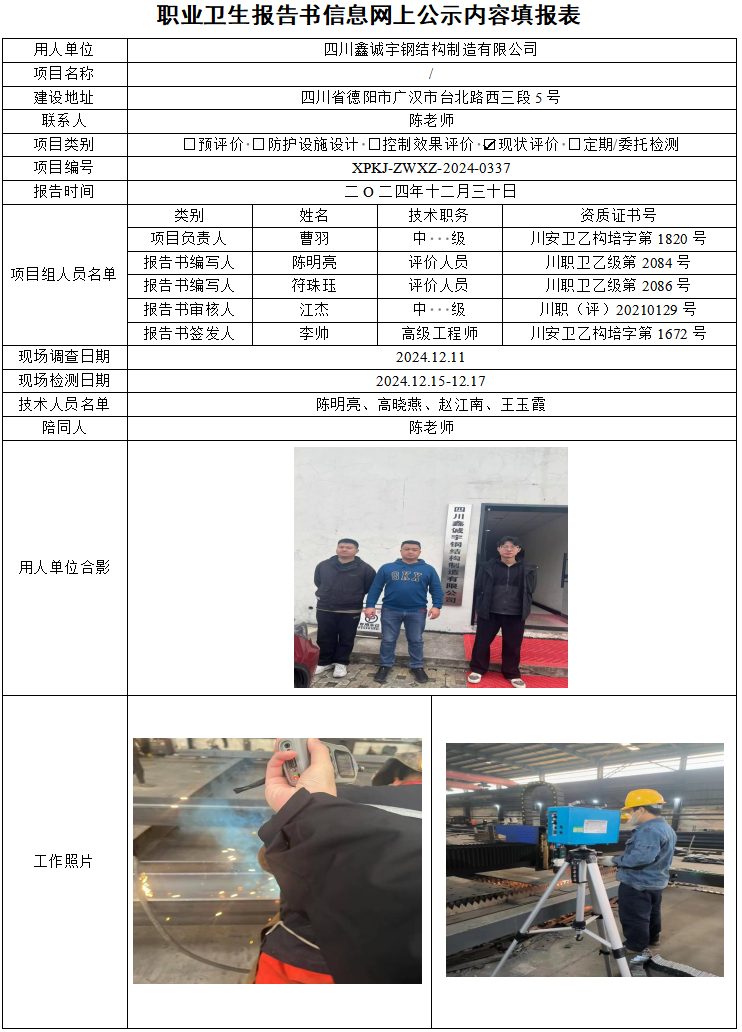 四川鑫诚宇钢结构制造有限公司职业病危害因素现状评价