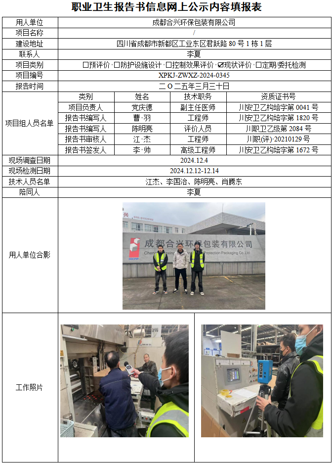 成都合兴环保包装有限公司职业病危害因素现状评价