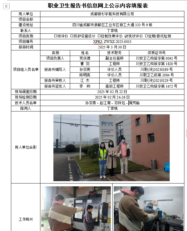 成都新杉宇航科技有限公司职业病危害因素现状评价