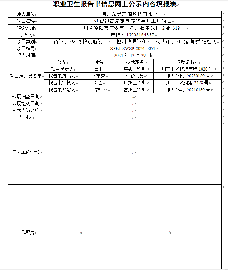 四川烽光玻璃科技有限公司职业病危害因素预评价