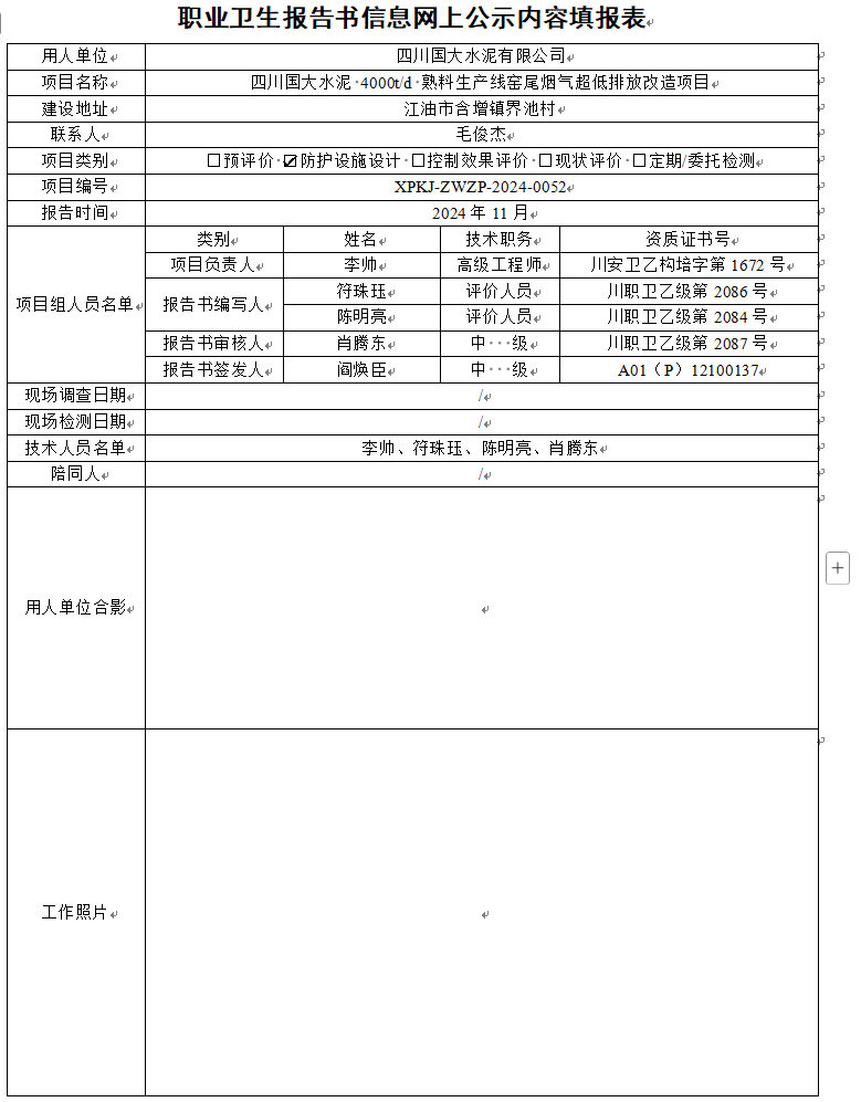四川江油国大水泥有限公司职业病危害因素防护设施设计专篇