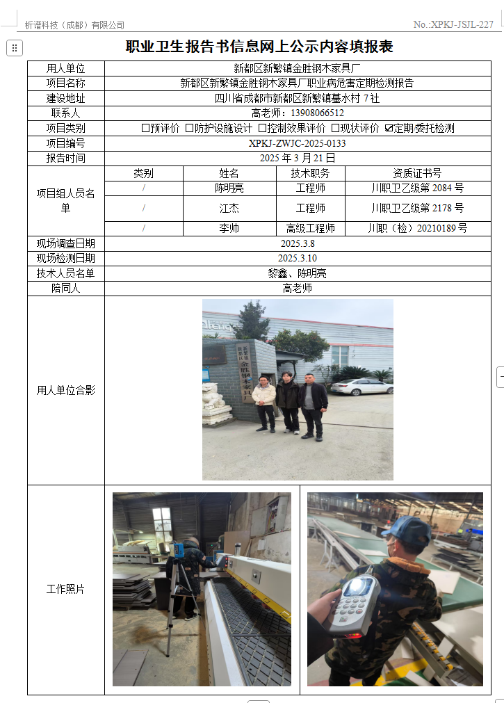 新都区新繁镇金胜钢木家具厂职业病危害因素定期检测