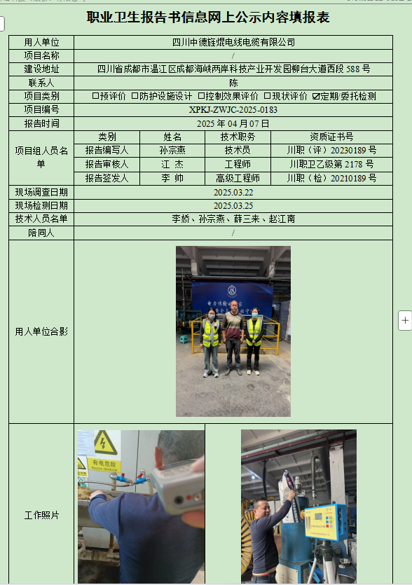 四川中德旌焜电线电缆有限公司职业病危害因素定期检测