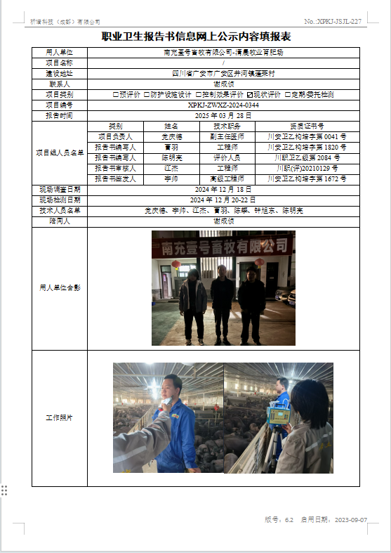 南充壹号畜牧有限公司职业病危害因素现状评价