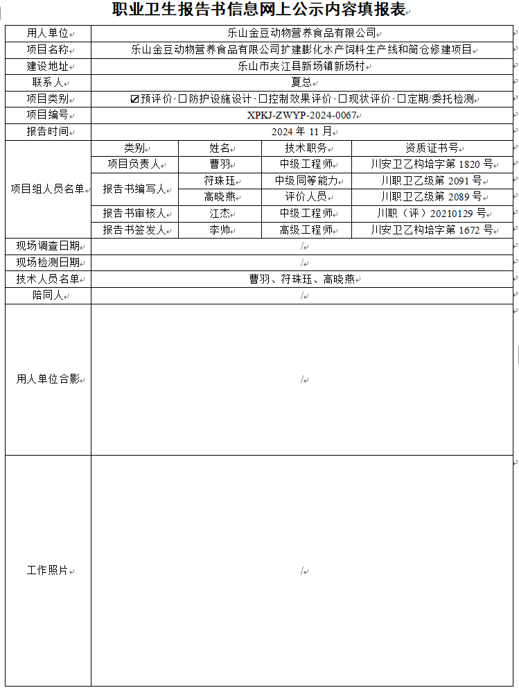 乐山金豆动物营养食品有限公司职业病危害因素预评价