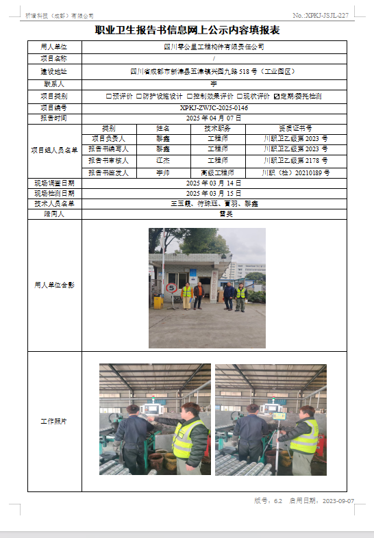 四川零公里工程构件有限责任公司职业病危害因素定期检测