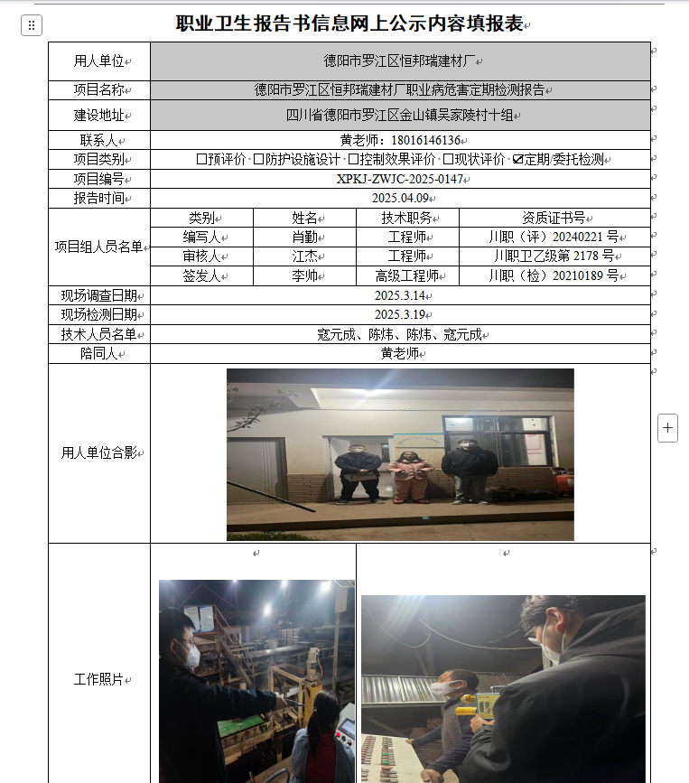 德阳市罗江区恒邦瑞建材厂职业病危害因素定期检测