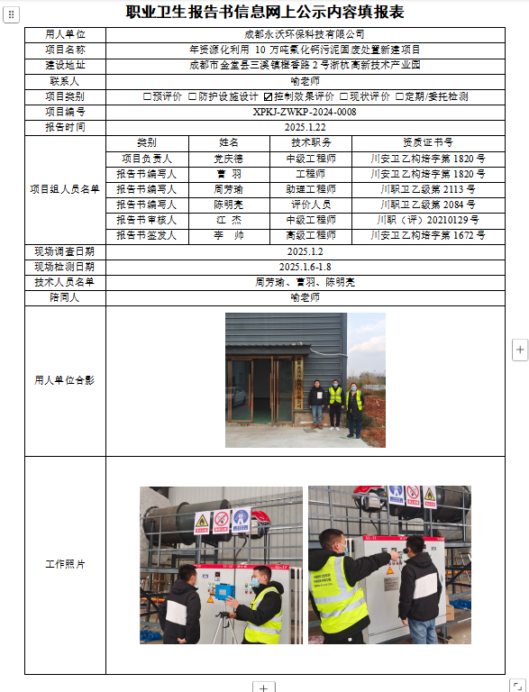 成都永沃环保科技有限公司职业病危害因素控制效果评价