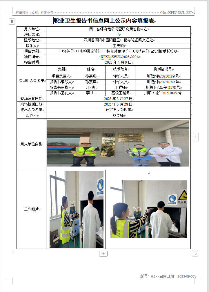 四川省综合地质调查研究所检测中心职业病危害因素定期检测