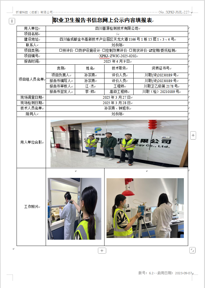 四川普源检测技术有限公司职业病危害因素定期检测