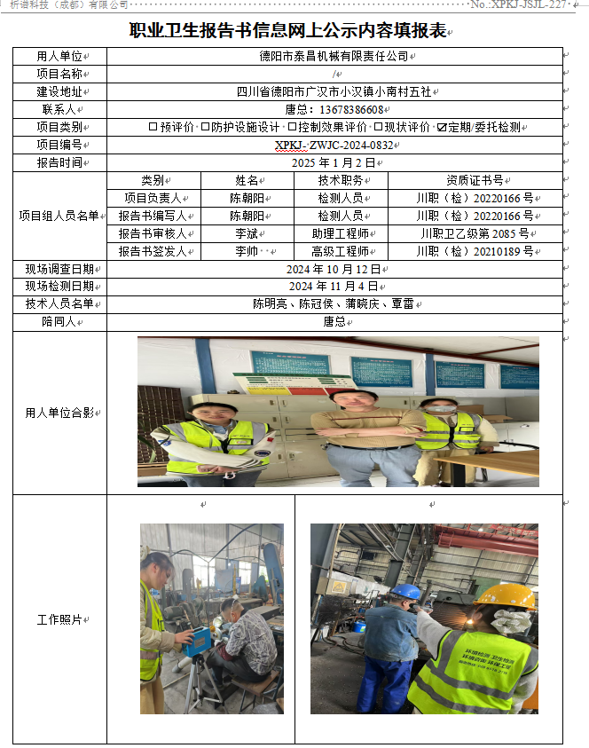 德阳市泰昌机械有限责任公司职业病危害因素定期检测