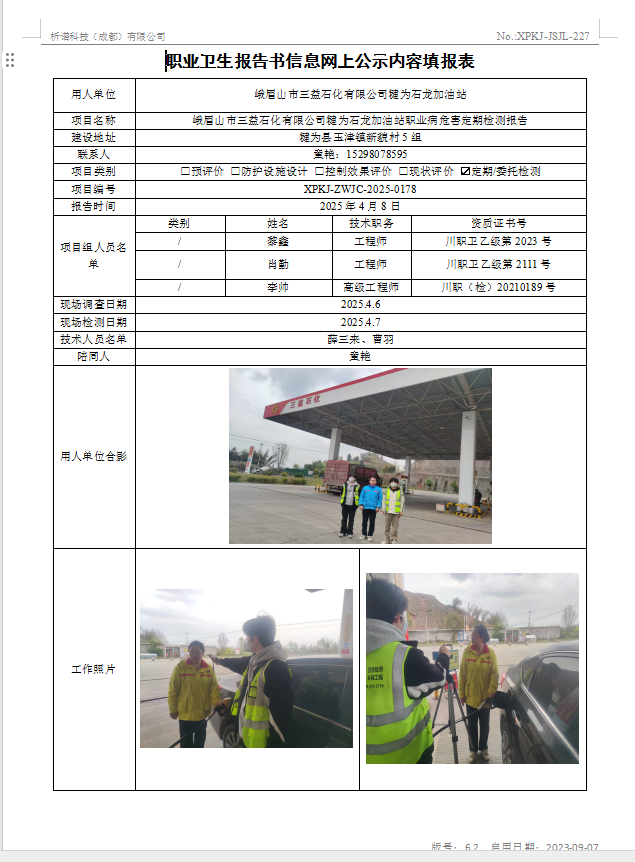 峨眉山市三益石化有限公司犍为石龙加油站职业病危害因素定期检测