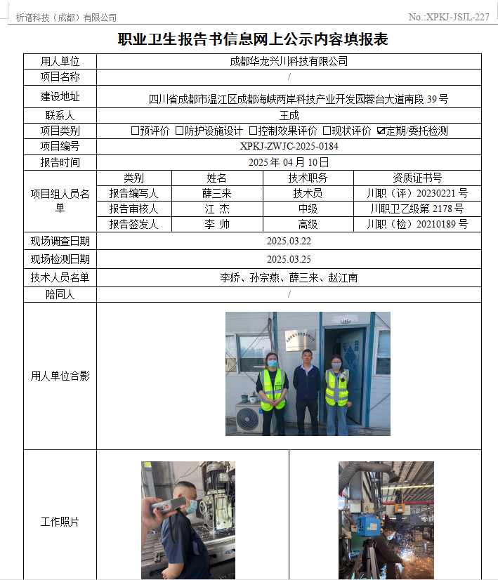 成都华龙兴川科技有限公司职业病危害因素定期检测
