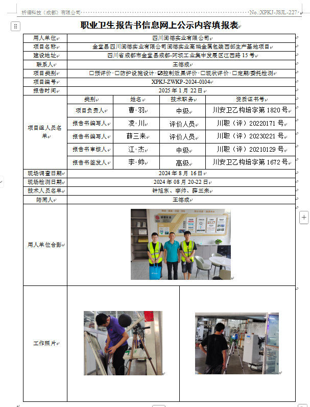四川闽德实业有限公司职业病危害因素控制效果评价