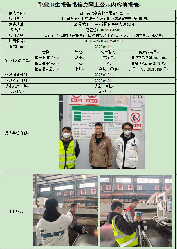 四川省永亨实业有限责任公司职业病危害因素定期检测