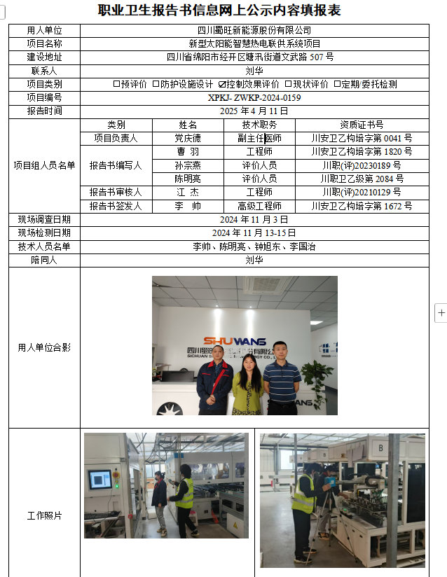 四川蜀旺新能源股份有限公司职业病危害因素控制效果评价