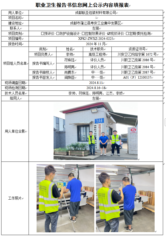 成都航圣包装材料有限公司职业病危害因素现状评价