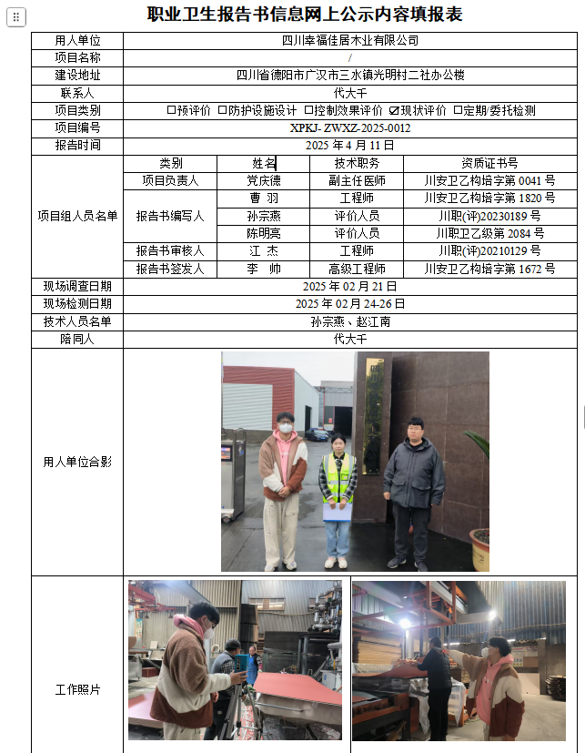四川幸福佳居木业有限公司职业病危害因素现状评价