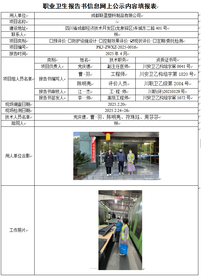 成都联盈塑料制品有限公司职业病危害因素现状评价