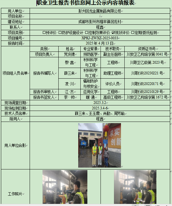 彭州回龙金属制品有限公司职业病危害因素现状评价
