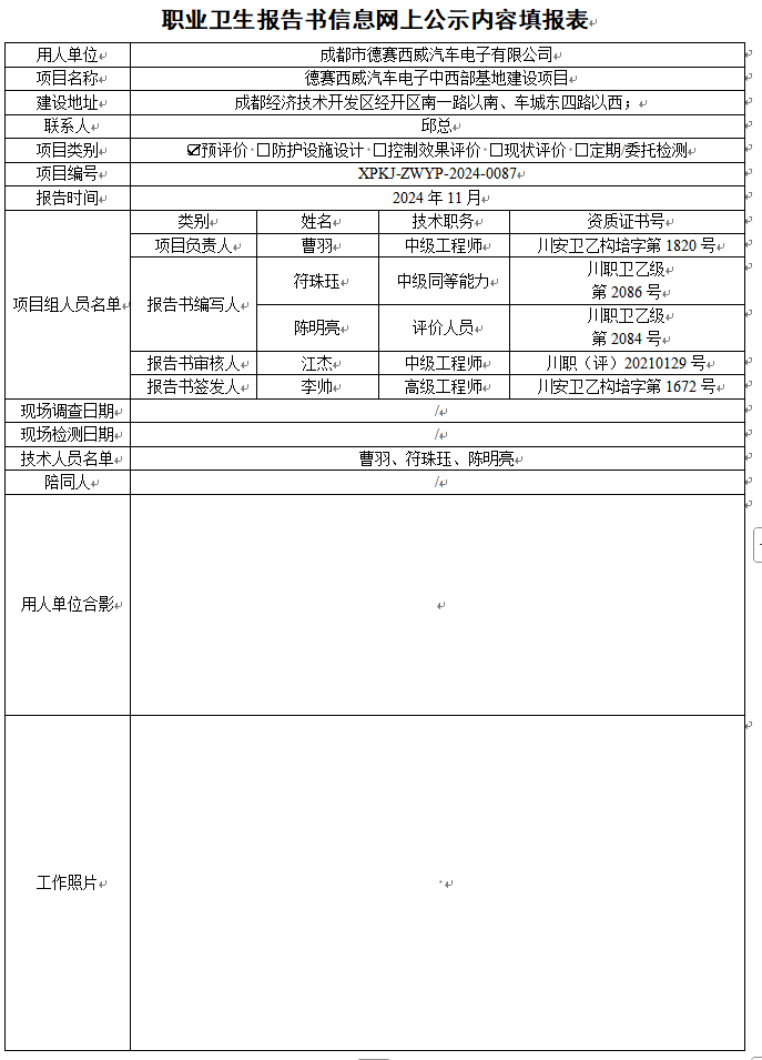 成都市德赛西威汽车电子有限公司职业病危害因素预评价