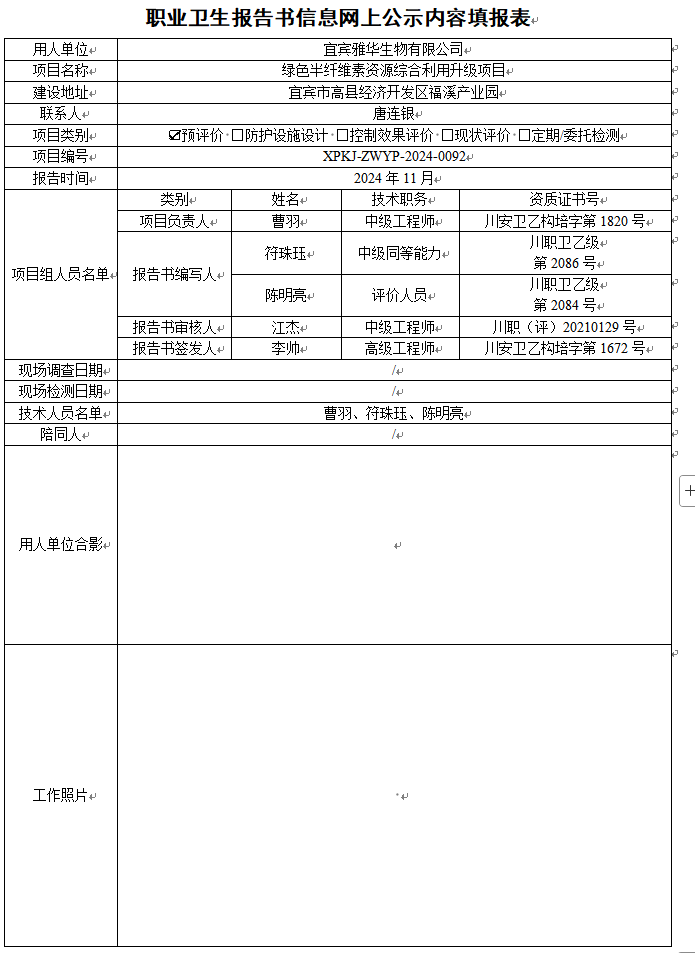 宜宾雅华生物有限公司职业病危害因素预评价