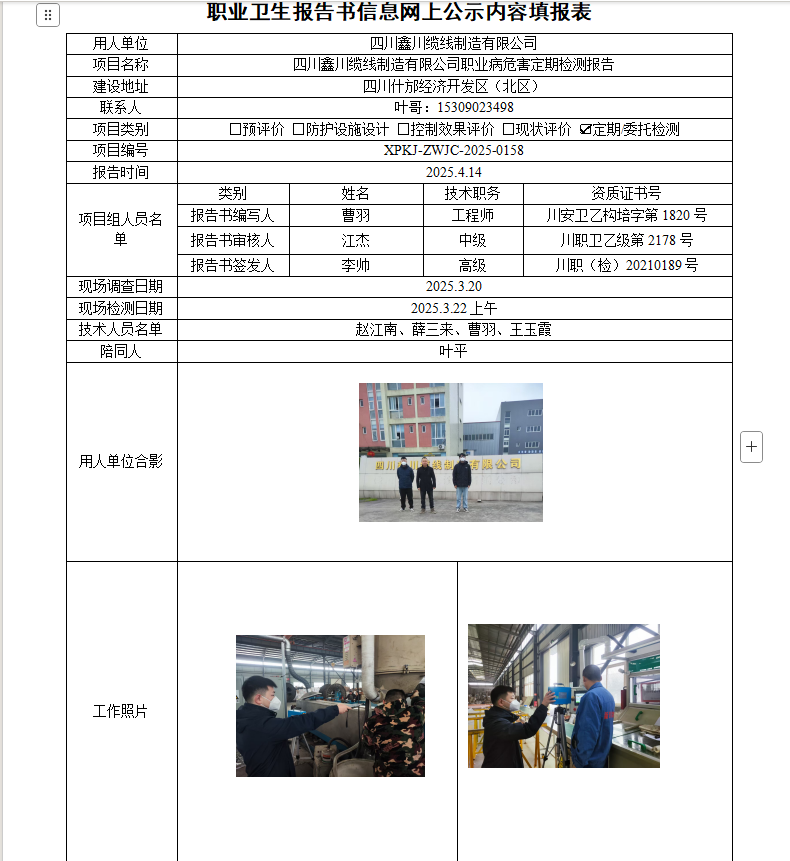 四川鑫川缆线制造有限公司职业病危害因素定期检测