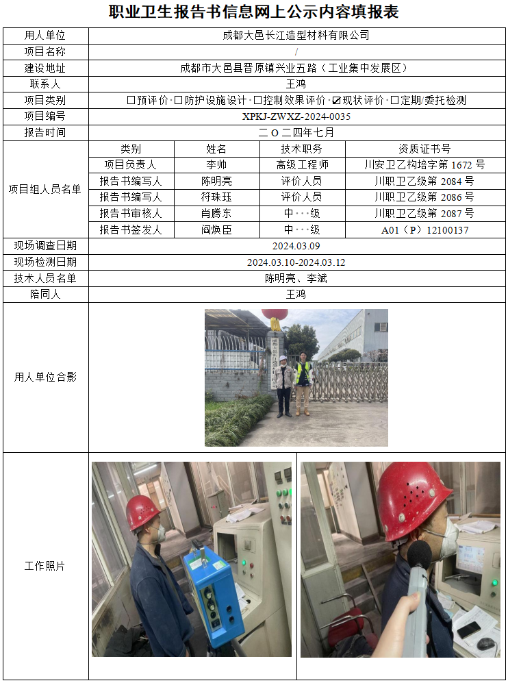 成都大邑长江造型材料有限公司职业病危害因素现状评价