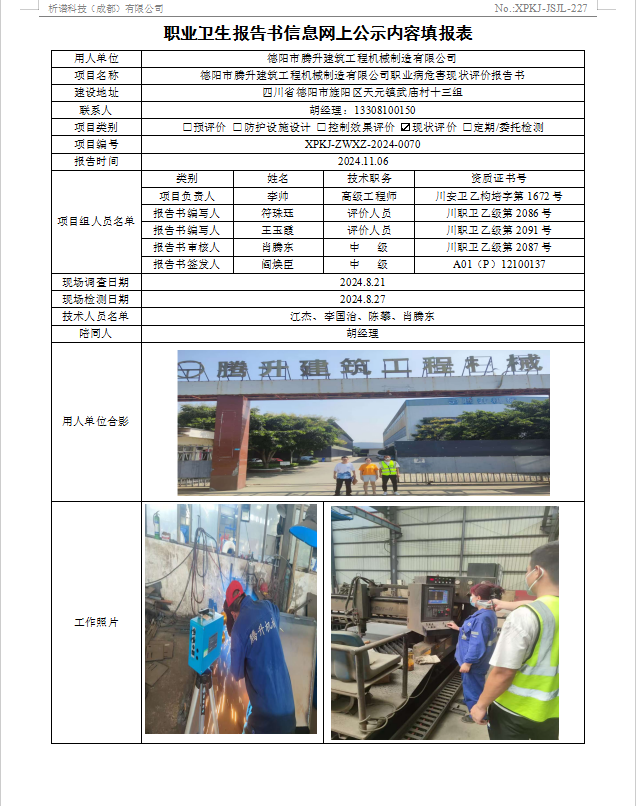 德阳市腾升建筑工程机械制造有限公司职业病危害因素现状评价