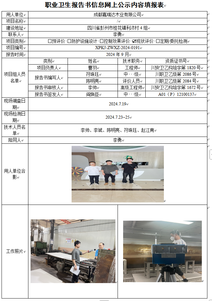 成都嘉瑞达木业有限公司职业病危害因素现状评价