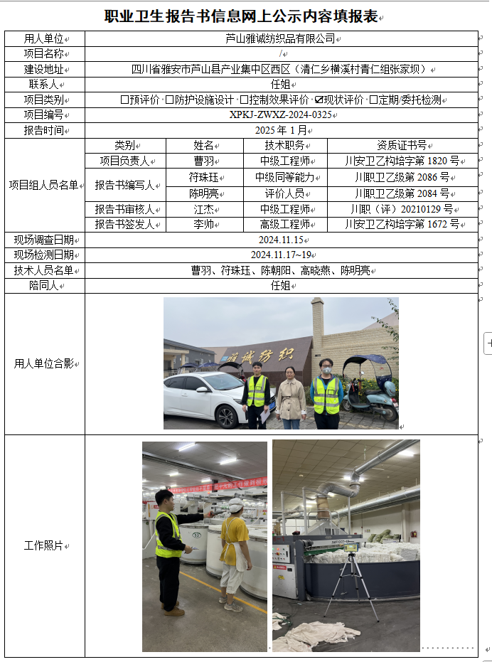芦山雅诚纺织品有限公司职业病危害因素现状评价