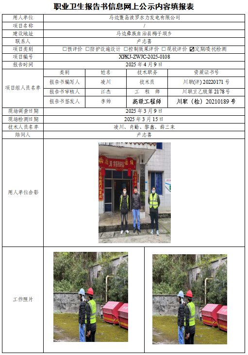 马边寰岛波罗水力发电有限公司波罗水电站职业病危害因素定期检测