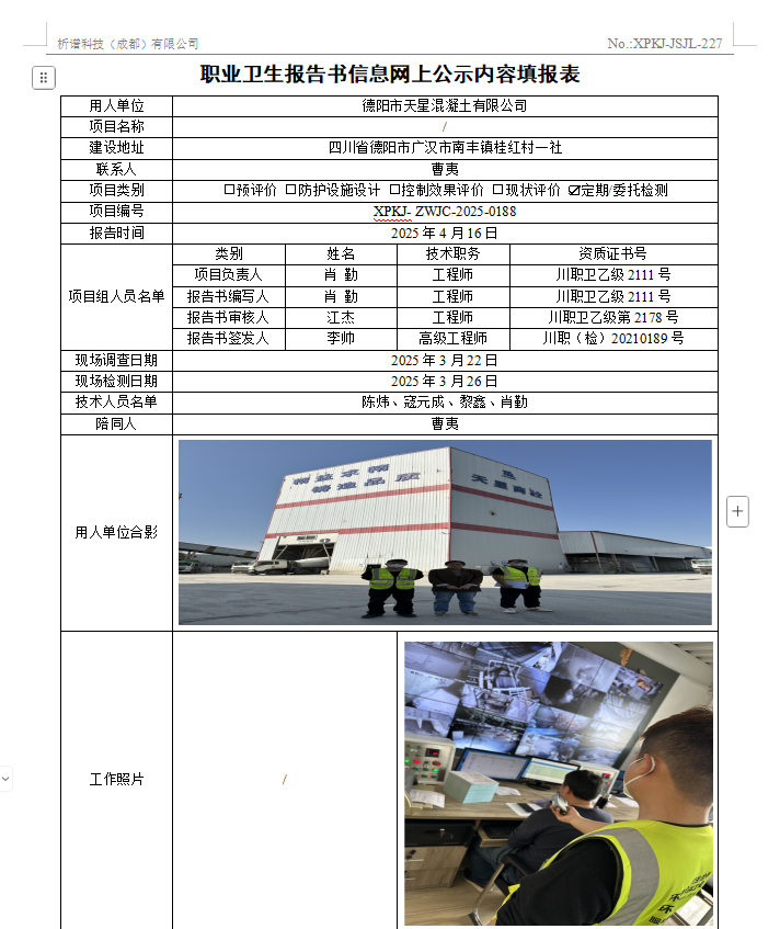 德阳市天星混凝土有限公司职业病危害因素定期检测